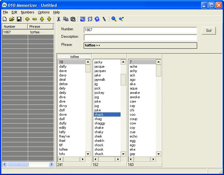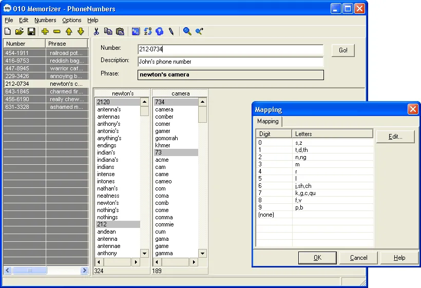 010 Memorizer is a free program designed to help users easily remember numbers such as phone numbers, PINs, social insurance numbers, credit card numbers, dates, IP addresses, and more. Instead of trying to recall long numerical strings, users convert numbers into memorable words or phrases using the Major System (phonetic system), which maps consonant sounds to digits. By forming vivid mental images from these words or phrases, retention improves dramatically. 010 Memorizer provides an intuitive interface for number-to-word conversion, offering lists of possible words based on phonetics and enabling users to build phrases from the beginning, end, or middle of a number. Associations — especially unusual, exaggerated, or animated ones — are encouraged to enhance recall.