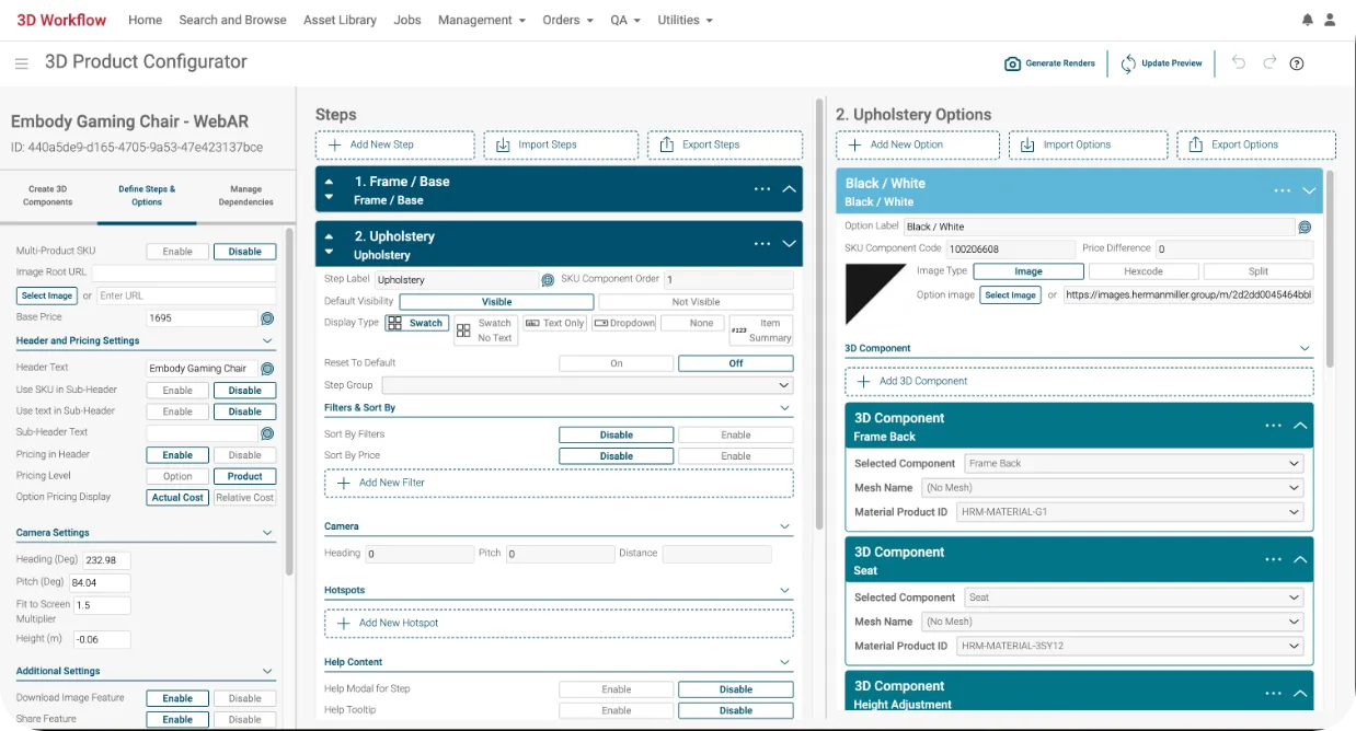 3D Cloud Product Configurators are intuitive, web-based tools that allow users to visually configure highly customizable products, view them in context, and make purchases on desktop or mobile devices. Included in the 3D Cloud Furniture Solutions Bundle, these configurators are designed to simplify complex product customization workflows while driving engagement and sales. With code-free deployment and WebAR capabilities, 3D Cloud Product Configurators deliver next-generation shopping experiences for furniture and office products.