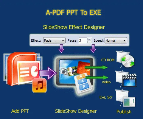 A-PDF PPT to EXE converts PowerPoint presentations into standalone executable files, screensavers, or video formats for easy sharing and viewing without Microsoft PowerPoint.