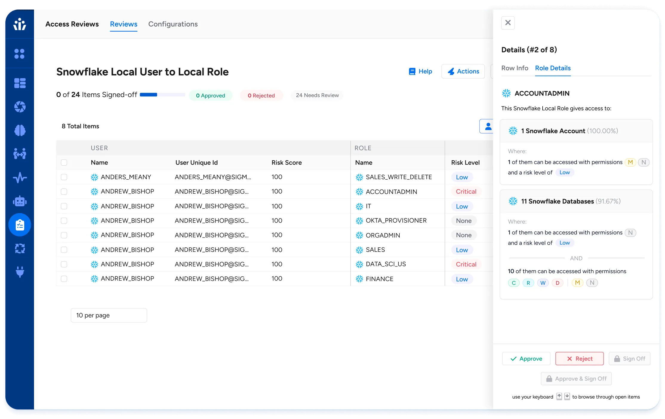 - Role Analytics: Give reviewers a clear understanding of access granted per role, including resource counts, access levels, and risk