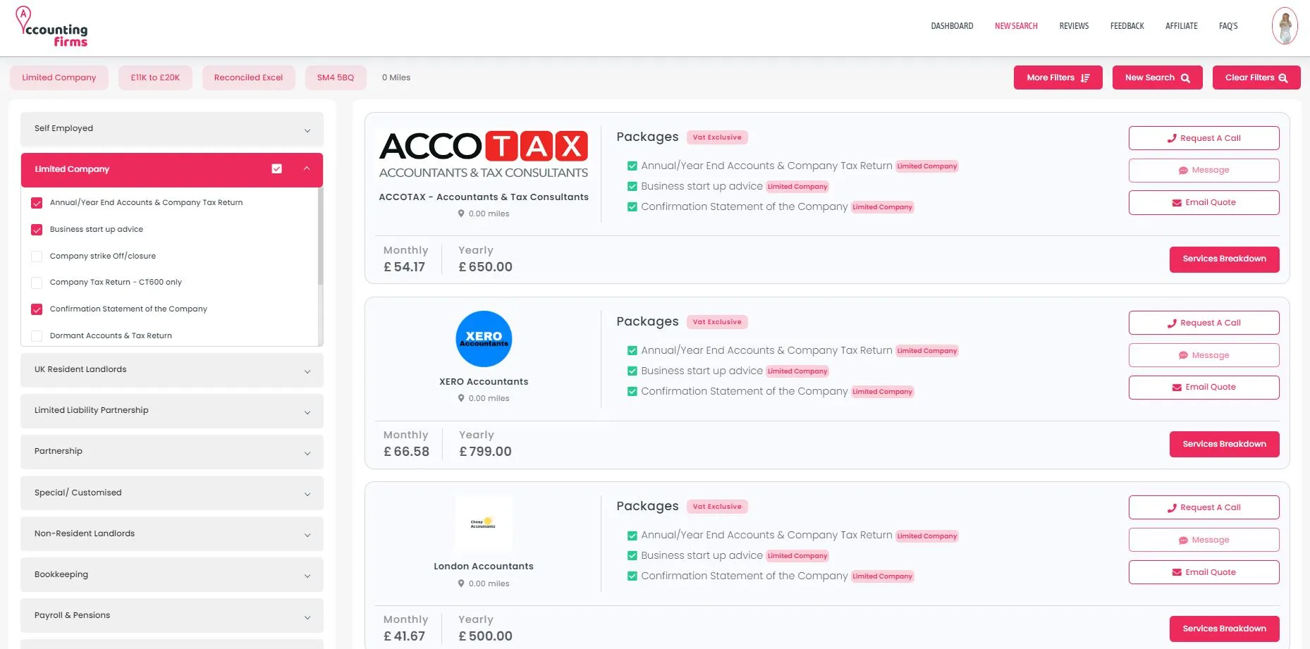 - Instant Comparison Tool: Users can compare accountants based on fees, qualifications, reviews, and proximity.