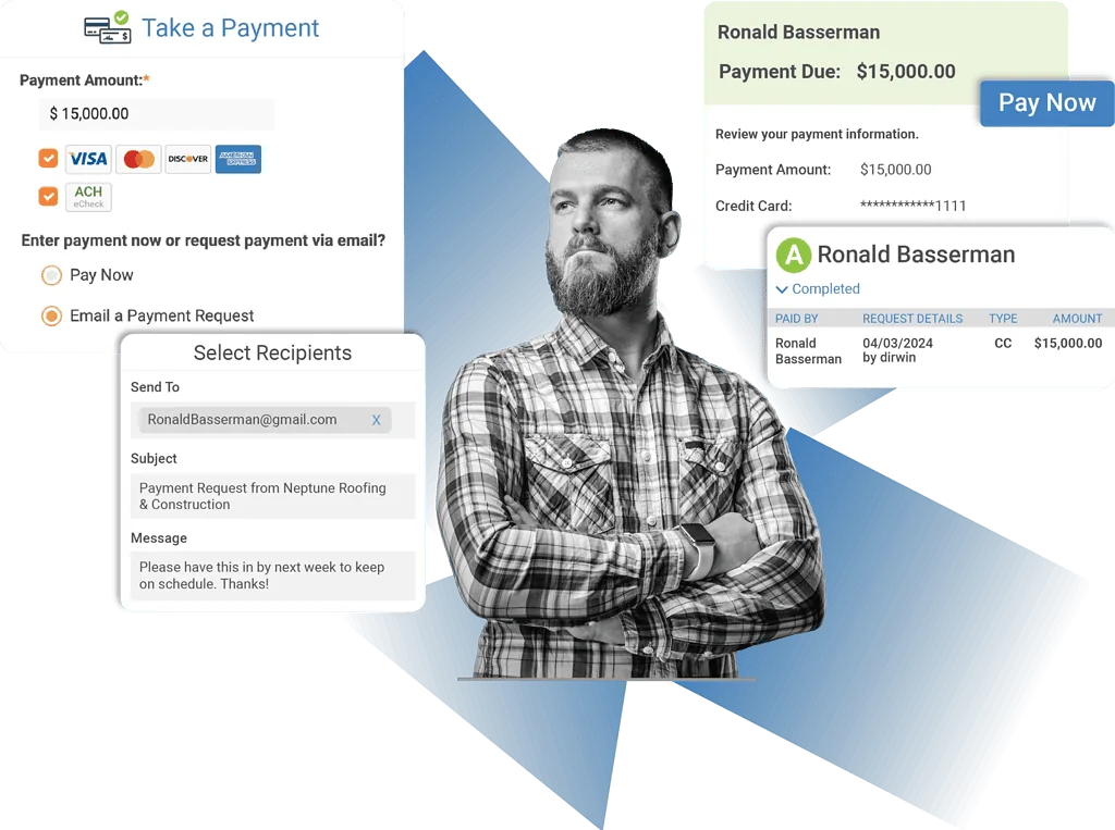 Built-in payments processing for roofing contractors, enabling credit/debit/ACH payments with next-day deposits and seamless integration with AccuLynx.