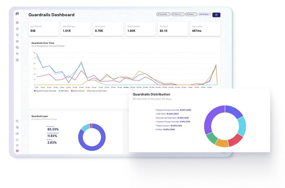 - Audit and Understand: Live observability across all layers, including inputs, outputs, user IDs, sessions, and applications.