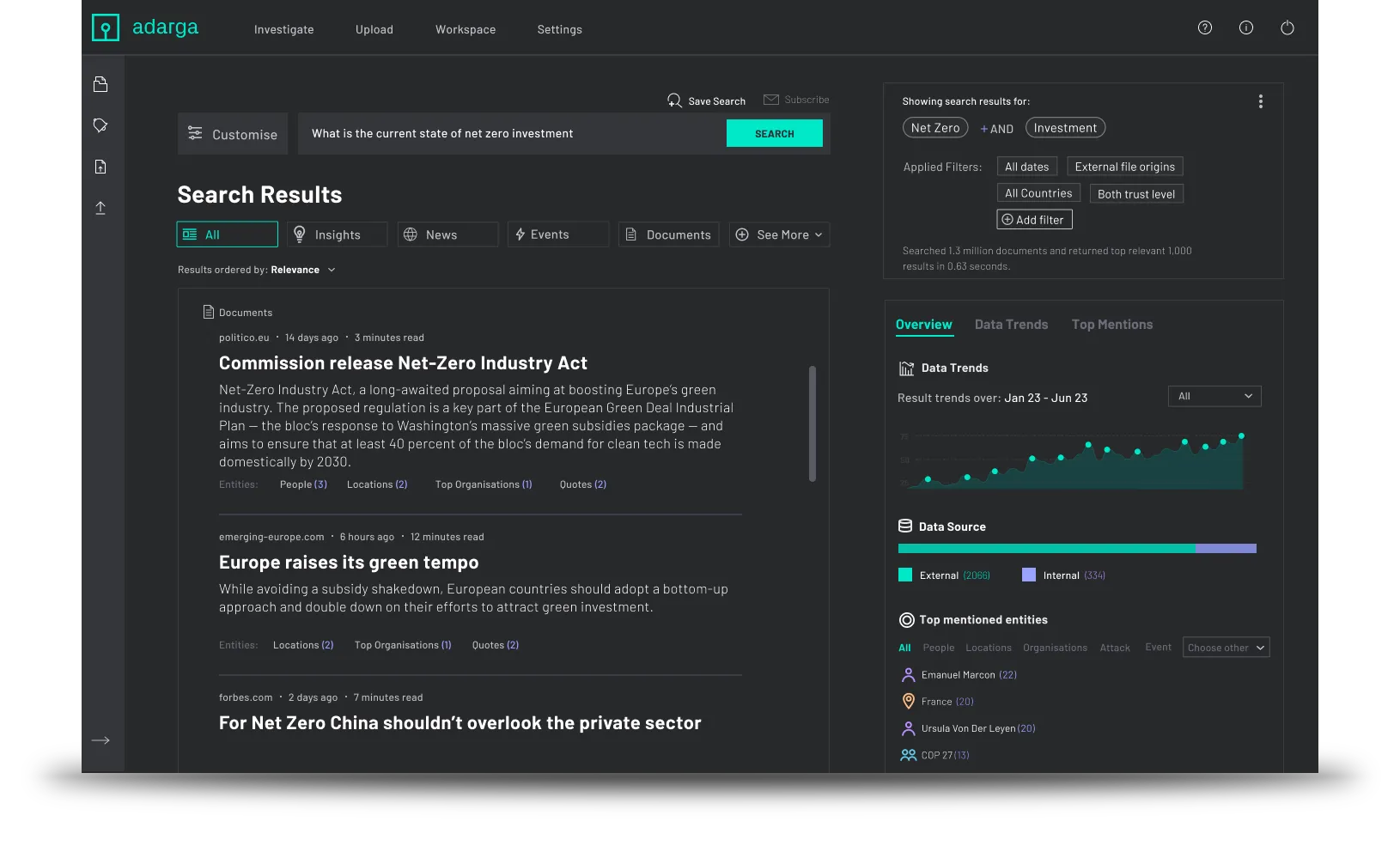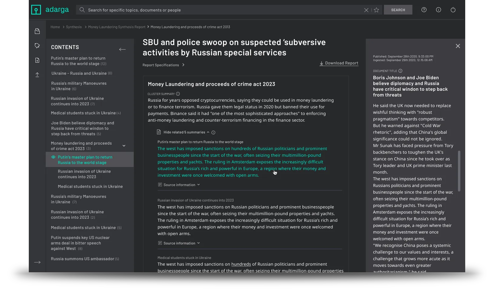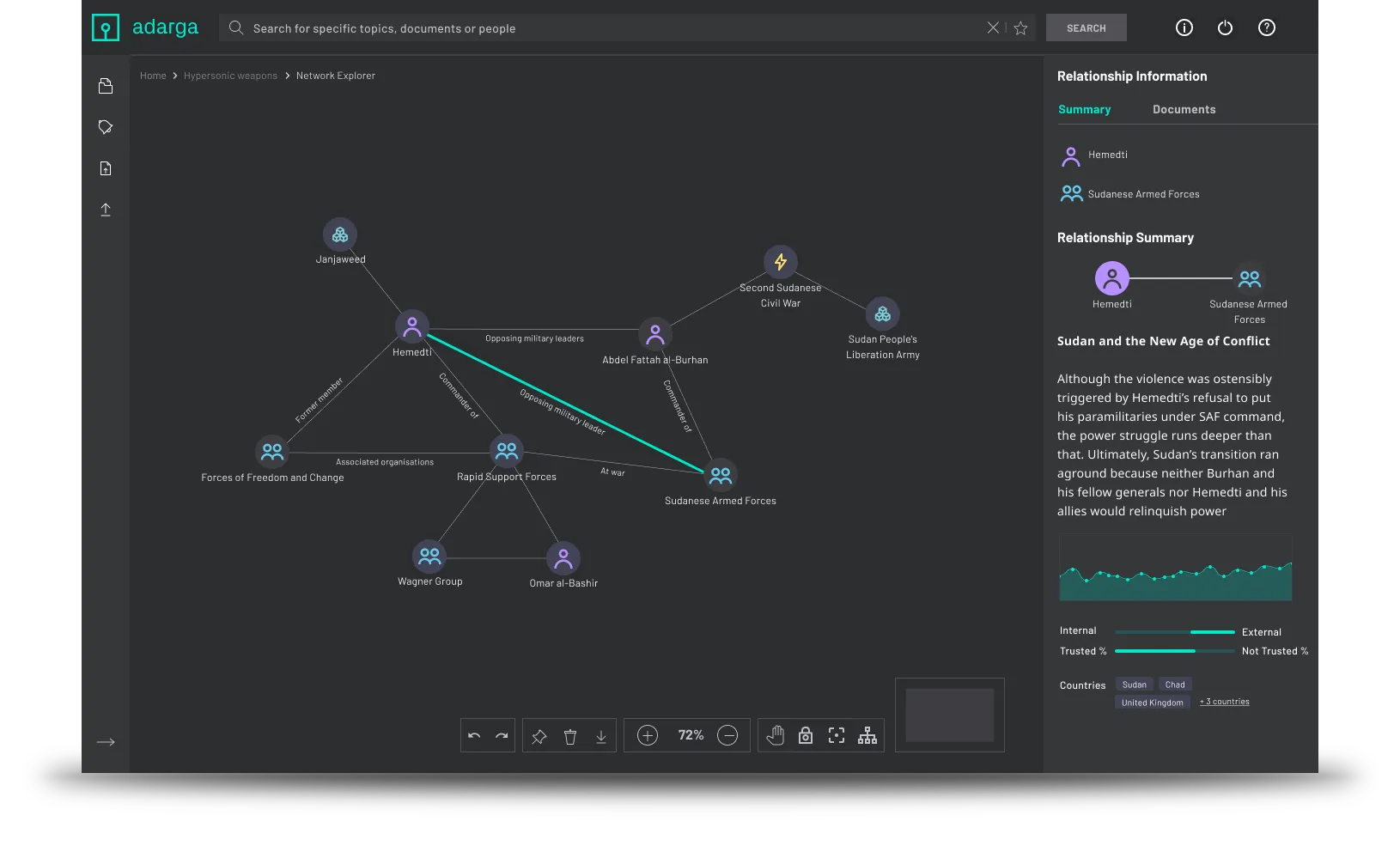 Adarga Vantage delivers decision advantage by supercharging research and analysis. It enables analysts and planners to gain a rich picture of information from millions of sources in different languages, providing dynamic insight and improved foresight to decision-makers. Built to augment human intelligence, Vantage offloads time-consuming tasks like information collection and processing, allowing users to focus on critical analysis. Designed for high-stakes environments, Vantage ensures responsible AI deployment with fully evidenced, transparent outputs.