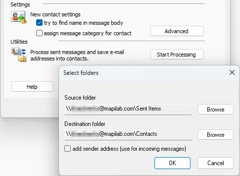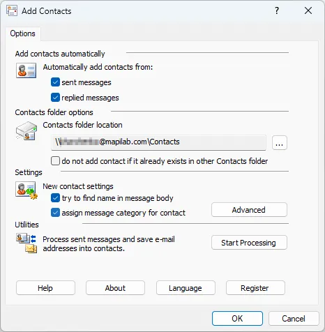 With a help of this add-on you can automatically store name and email address of message sender or recipient into Outlook Contacts. Also you can process the messages which you received or sent out earlier and store your respondents in your Contacts.