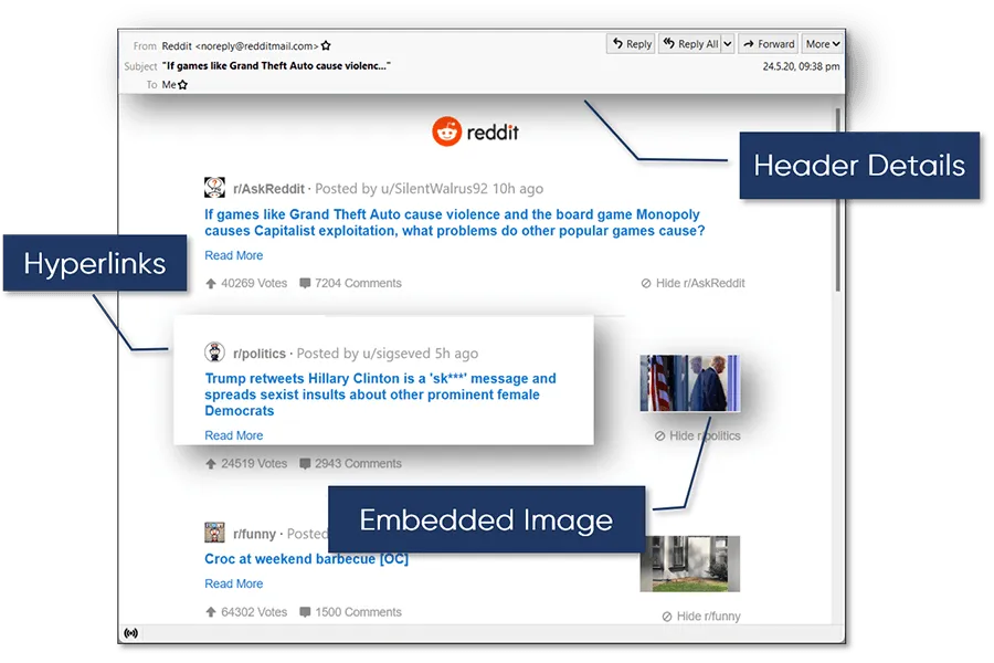 Attachment Handling Retains and embeds or saves email attachments during conversion.