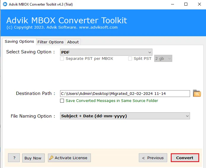 Advik MBOX to PDF Converter is a Windows desktop application designed to convert MBOX files—including their attachments—into PDF documents. The software supports both selective and batch conversion, allowing users to add individual MBOX files or entire folders for processing. It offers multiple file naming conventions for organizing output PDFs, such as by subject, date, or sender. The tool preserves all email components, including attachments, formatting, headers, and folder structure, ensuring the integrity of the original data. It is suitable for users who need to archive, print, or share email content in a universally accessible format. The software is user-friendly, requires no technical expertise, and is available in multiple languages.