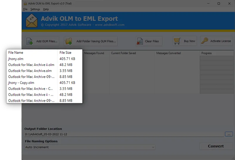 Advik OLM to EML Converter is a standalone software tool for Windows and Mac that converts Outlook for Mac (OLM) files into EML format. The application supports both single and batch conversion, allowing users to process multiple OLM files or entire folders at once. It preserves all essential email properties, including attachments, headers, body, date, and folder hierarchy, ensuring that the converted EML files retain the original structure and content. The software offers selective conversion using filters such as date range and folder selection, and can preview emails before export. It is compatible with all major OLM file versions, supports large files without size limitations, and provides a user-friendly interface suitable for both technical and non-technical users. The tool also supports multiple languages, generates detailed log reports after conversion, and does not require Outlook installation. The converted EML files can be imported into various email clients, including Windows Live Mail, Thunderbird, and others.