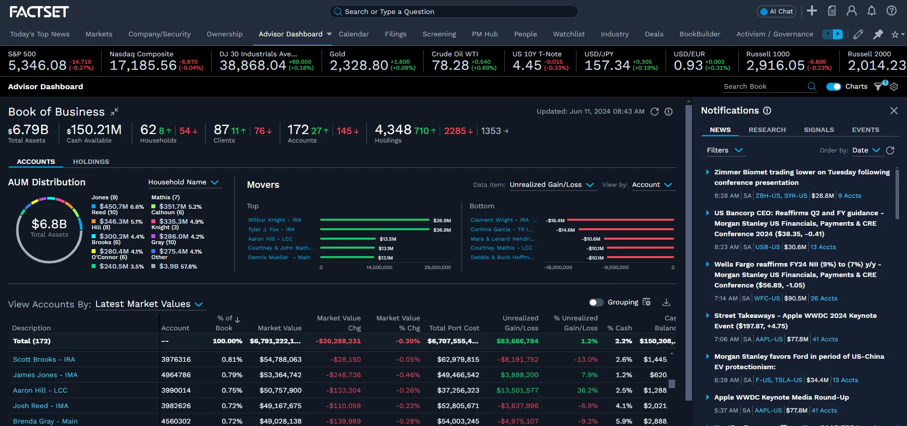 - Track market activity in real time with seamless integration of market-moving news and research into one consolidated view with the ability to sort by date, assets under management, and the number of accounts impacted.