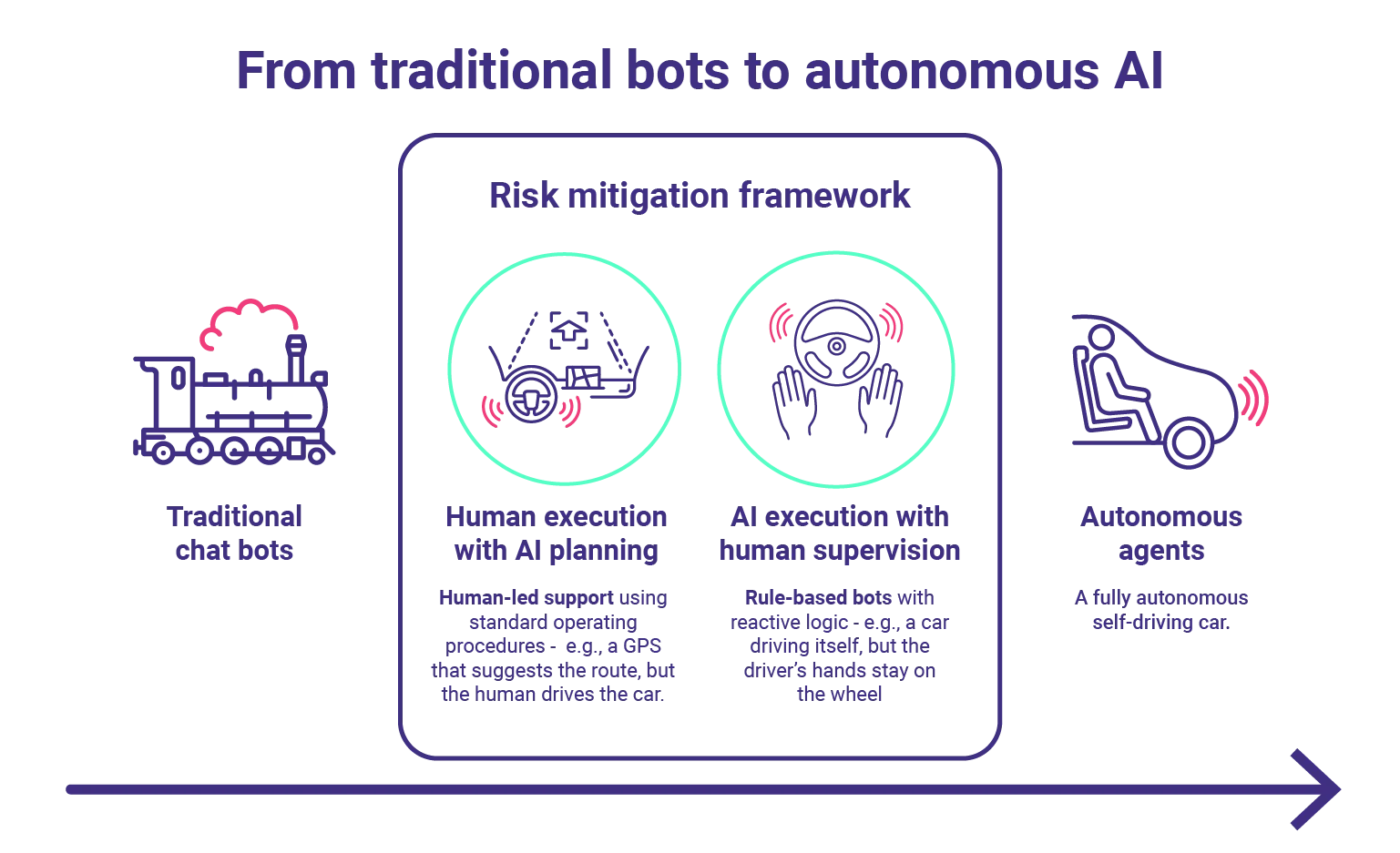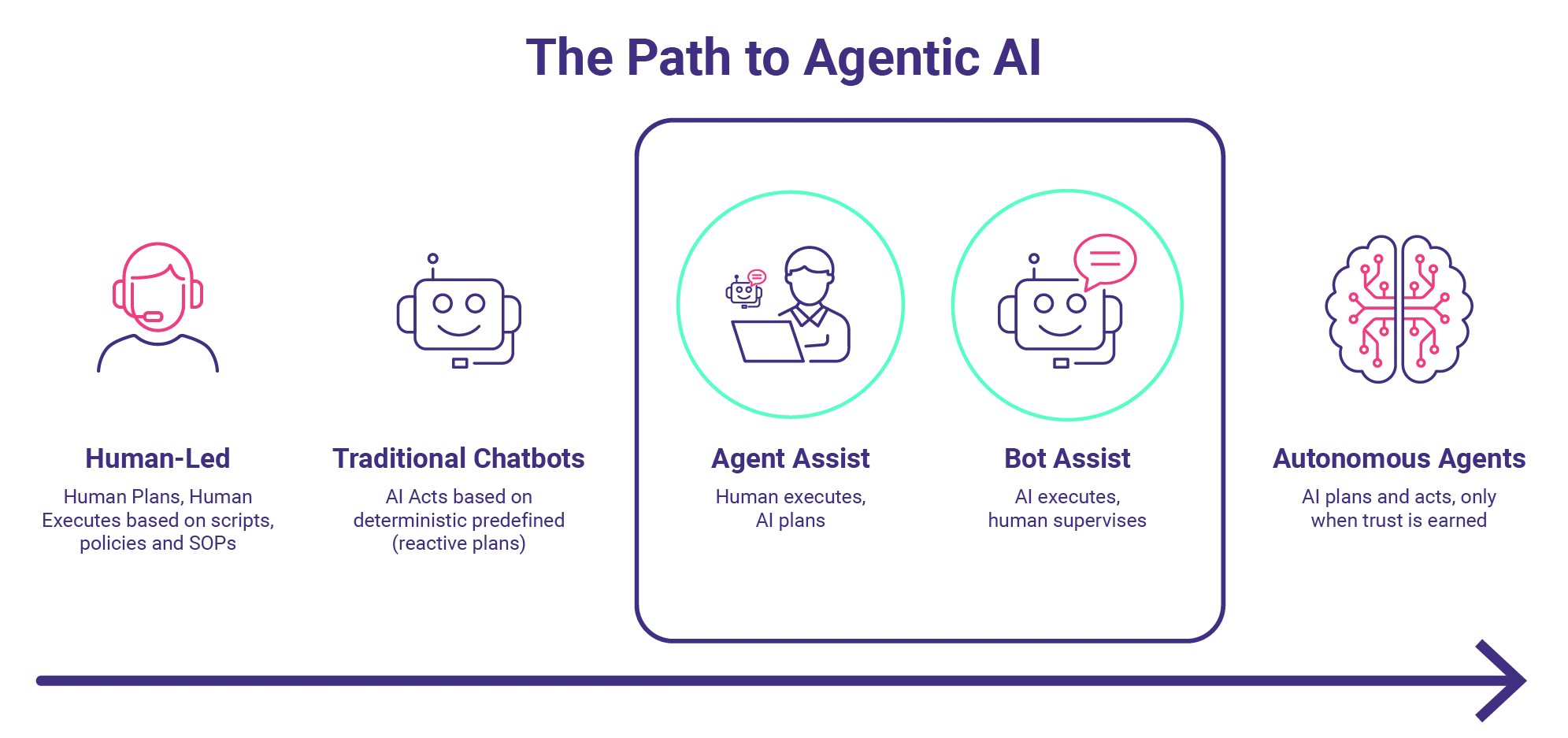- **Adoption Framework & Trust: **A phased adoption model (Agent Assist → Bot Assist → Autonomous Agent) that prioritizes gradual trust-building and governance rather than an immediate jump to full autonomy. This reduces risk and preserves human oversight during maturity.