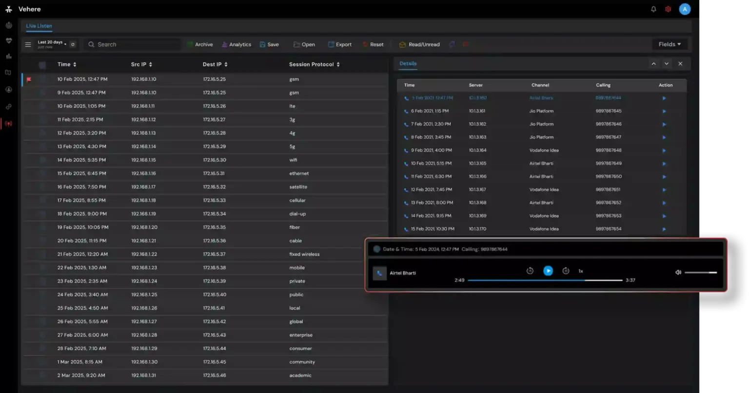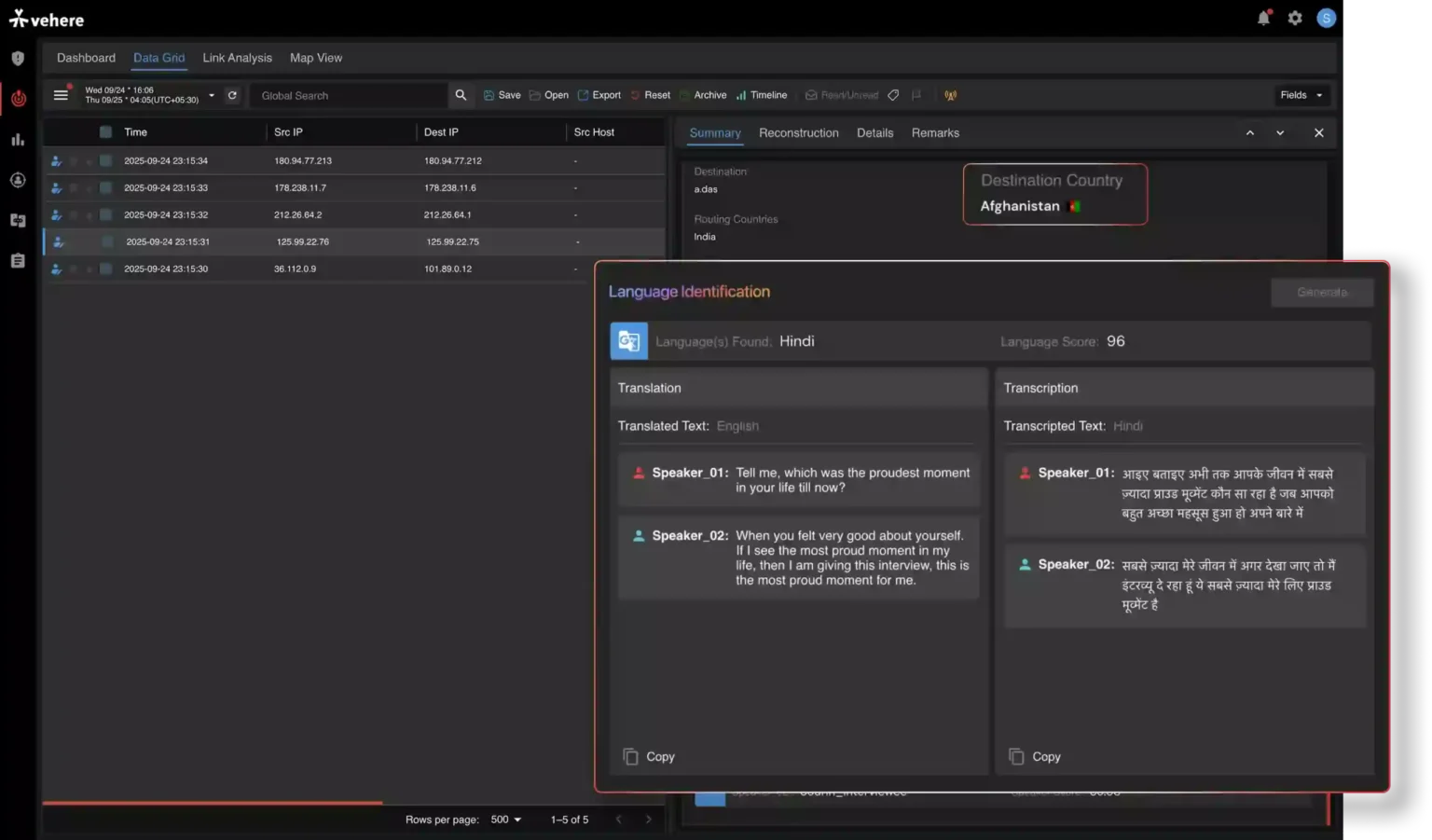 Vehere's AI Counter-Terrorism platform provides agencies with the capability for real-time data collection and large-scale analysis across networks. It is designed to detect, decode, and disrupt threats with precision, enabling users to understand current locations and predict future movements of adversaries. The platform offers advanced capabilities such as seeing the unseen, connecting disparate information, breaking language barriers through audio analysis, cutting through noise to flag critical events, and decrypting intent even when content is obscured. It facilitates the identification of connections and mapping of information across entities, revealing fragmented identities and relationships through shared identifiers. Profiles are enriched with contextual data for deeper operational understanding, allowing for the pinpointing of entities of interest within massive datasets. The platform emphasizes control, privacy, and integrity through a secure, policy-driven framework, ensuring lawful and ethical data analysis with insights that align with legal and regulatory standards. Role-based access control and advanced PII detection for data privacy are integral. Its modular and scalable architecture supports broad use cases across tactical, operational, and strategic missions, including mass network intelligence, lawful interception, cyber vigilance, crime investigation, entity profiling, collecting foreign signals, and detecting cyber threats to critical infrastructure.