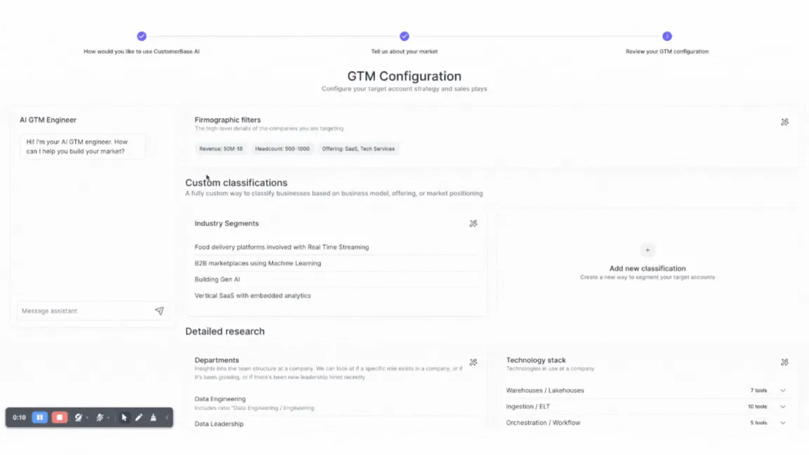 CustomerBase.ai is an AI-powered Go-To-Market (GTM) platform designed to help B2B revenue teams identify, score, and engage the most relevant accounts with precision and speed. Acting as an “AI GTM Engineer,” the platform analyzes your market in real time, enriches CRM data, and delivers actionable insights directly into your sales and marketing workflows—without requiring complex setup or engineering support.