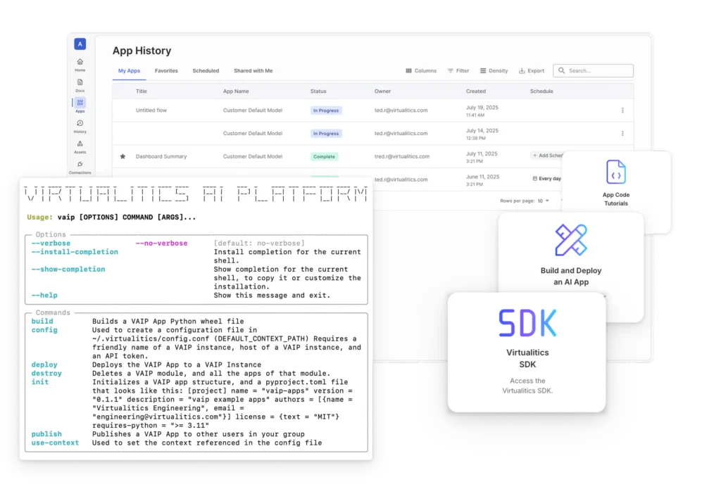 - **Developer Experience: **Bring Developers a Platform Designed to Overcome Obstacles - Building AI is one thing, but building AI for decision enablement in sophisticated enterprises can be incredibly challenging. - The Virtualitics Developer Experience helps teams avoid deployment paralysis and launch impactful AI applications. - **Build Interactive AI Applications: **The Virtualitics Developer Experience includes an SDK and an API and is ready for enterprise-level business from the start. You have the ability to create your own AI application to reside on our platform. - Create within a pure Python low-code environment - Develop experiences and explanations around AI and predictive models to inform decisions - Utilize interactive software that goes beyond dashboard.. - **Build AI Agents: **Build AI Agents to support any solution. Utilize our GenAI Toolkit as a foundation for AI agent development. - Includes: - Readiness Sigma (RSIG): Condenses large groups of reports to surface key insights fast. - Retrieval-Augmented Generation (RAG): Connects secure, trusted data sources to GenAI models for grounded responses. - Containerized LLMs: Deployable on any approved system, keeping sensitive data protected and models mission-specific. - Developer Interfaces: Enables easy integration of GenAI capabilities into AI applications running on the Virtualitics AI Platform.