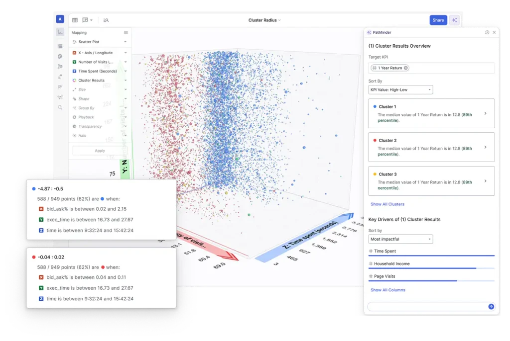 - **Data Exploration: **Using AI to Explore, Illustrate, and Illuminate the Insights in Your Data - Provide AI guidance that uncovers deep data insights while creating data stories that leadership teams can follow. - Our approach to AI uncovers hidden patterns in complex data and generates 3D visuals and explanations to give you confidence in your next data-driven decision. - Smart Mapping: Helps users instantly understand the key drivers in their data and presents relevant 3D visualizations of key drivers. - Anomaly Detection: Identifies points that are statistical outliers or have extreme values for combinations of features. - Network Extractor: Enables users to generate Network Graphs from tabular datasheets.