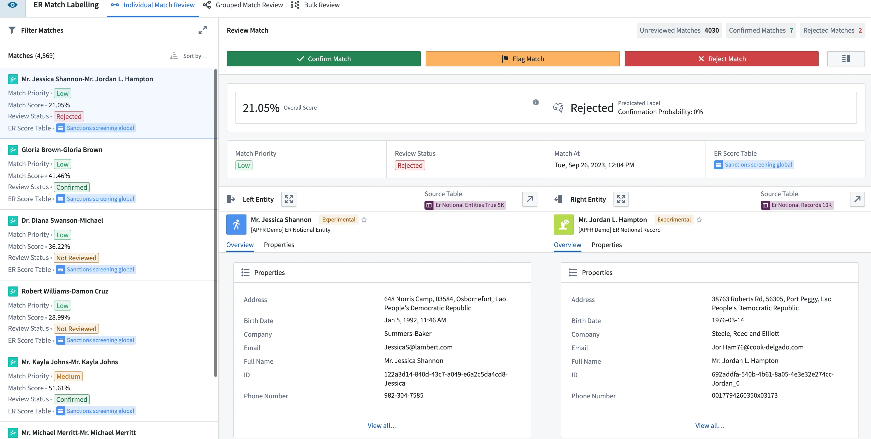 The Entity Resolution Framework offers a comprehensive toolset designed to facilitate the identification of similar entities. With a scalable architecture, this robust solution includes a user-friendly Configuration Interface and a Match Confirmation Interface, both of which are operational immediately and fully customizable.