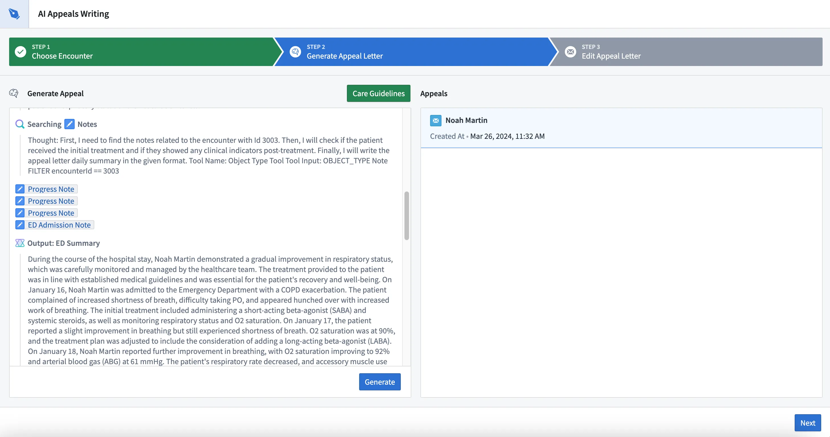 Optimize the hospital appeal process by using AIP to analyze denials, extract supporting evidence from patient charts, and draft customized appeal letters in accordance with insurance company guidelines.
