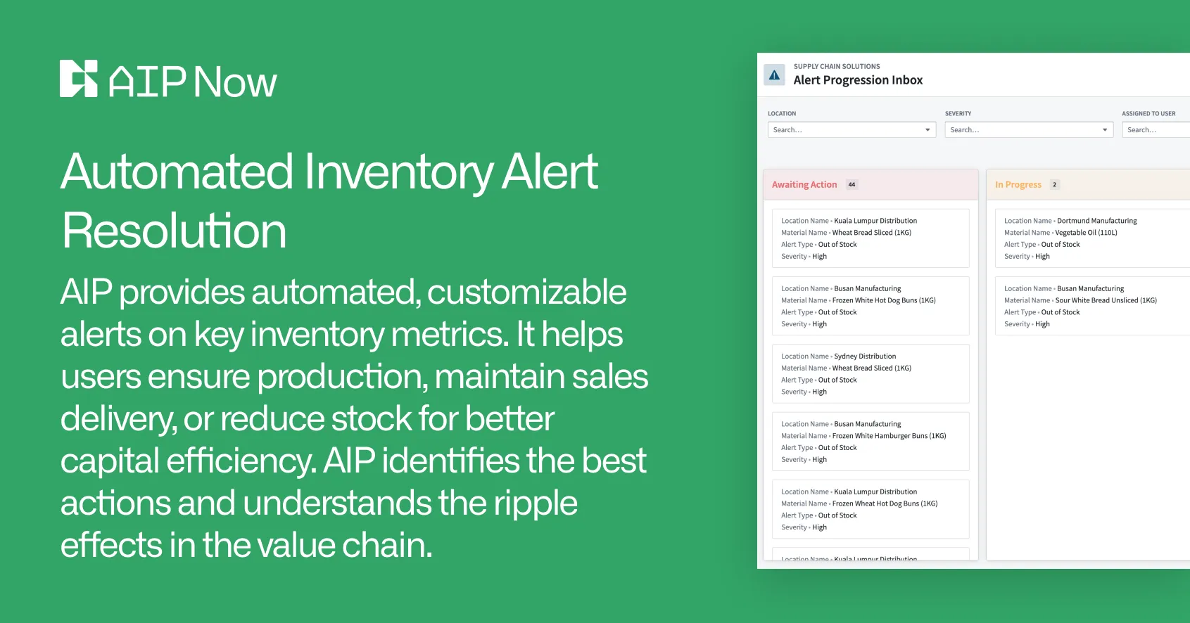 - Automated Inventory Alert Resolution: This feature combines both automated alerting on key inventory metrics and events with organization-specific configurations. This helps users identify opportunities to ensure production continuity or sales delivery - or alternatively, opportunities to reduce stock and drive working capital efficiency. AIP enables the operator to traverse the value chain ontology and identify the best course of action to resolve issues, understanding the knock-on effects and dependencies of even simple activities, such as shifting production from one location to another.