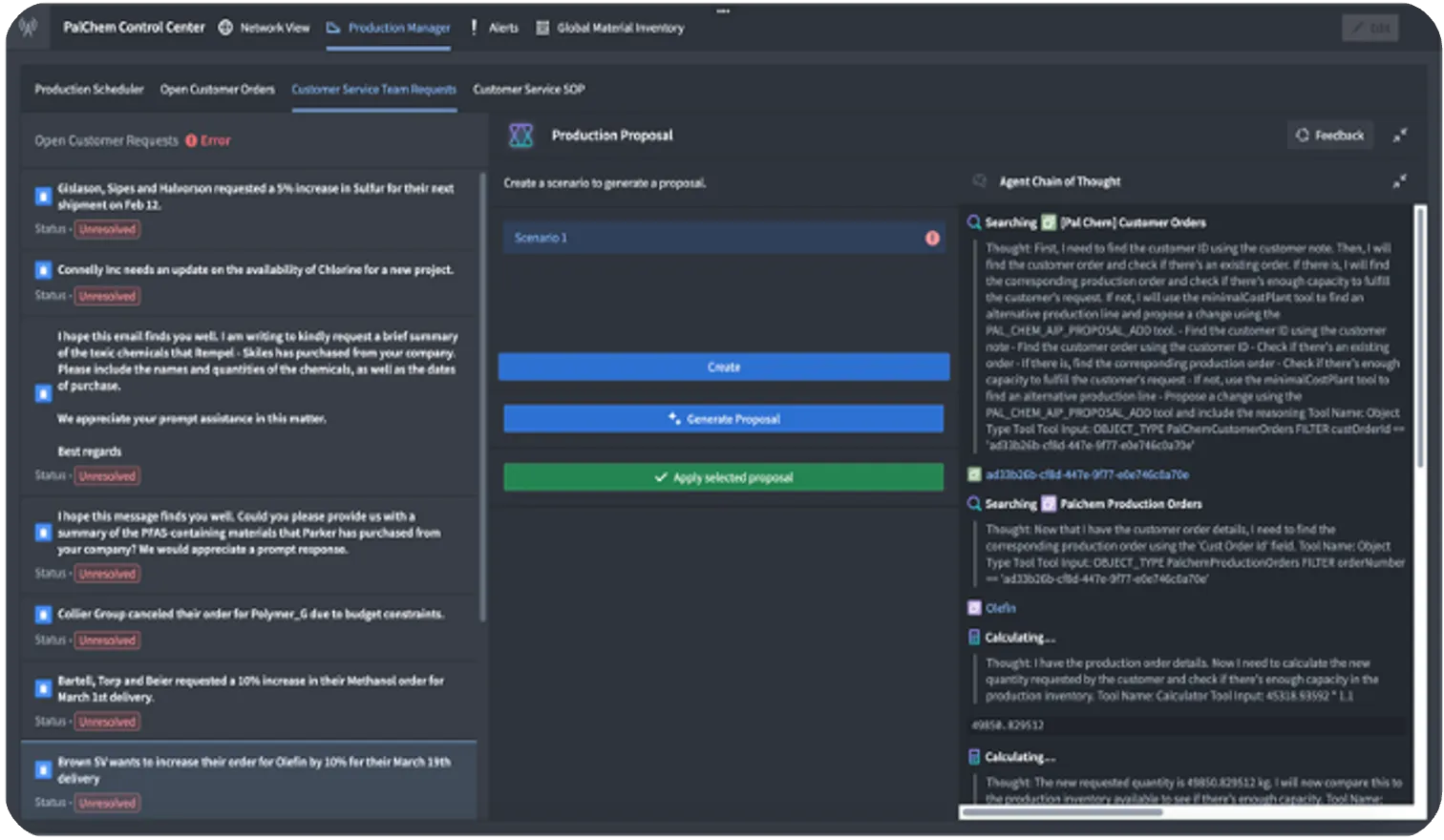 Using AIP, Operators can create optimized schedules and continuously reoptimize operations as disruptions occur. Users create optimized production schedules across plant networks by integrating source systems including ERP, MES, PLM, unstructured customer requests and invoices. With AIP, operators can more proactively manage order changes, considering factors like OTIF, COGS, energy, and emissions, all while capturing operator feedback for continuous improvement and enhanced network resilience.
