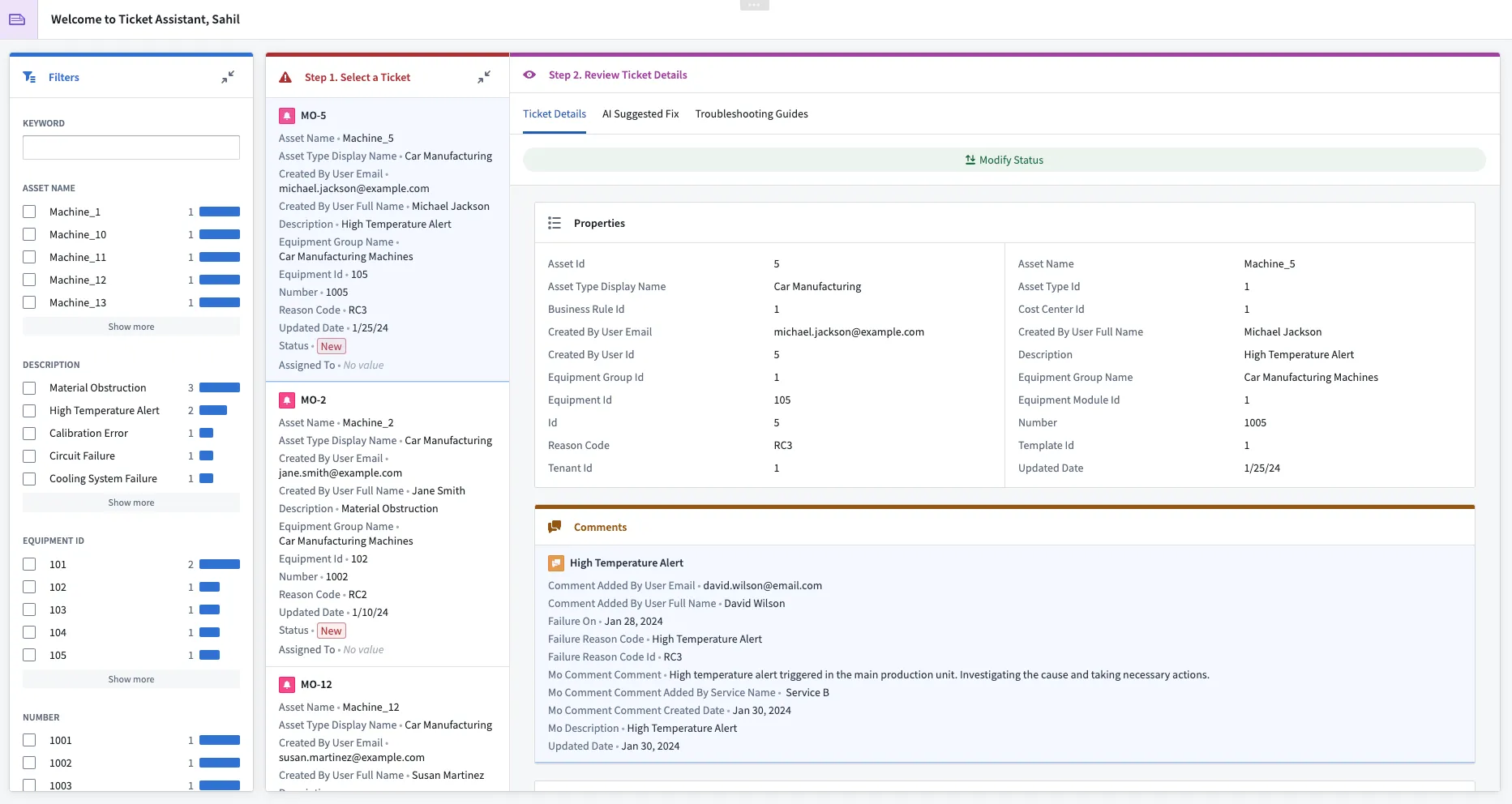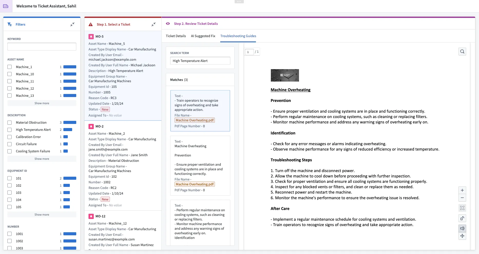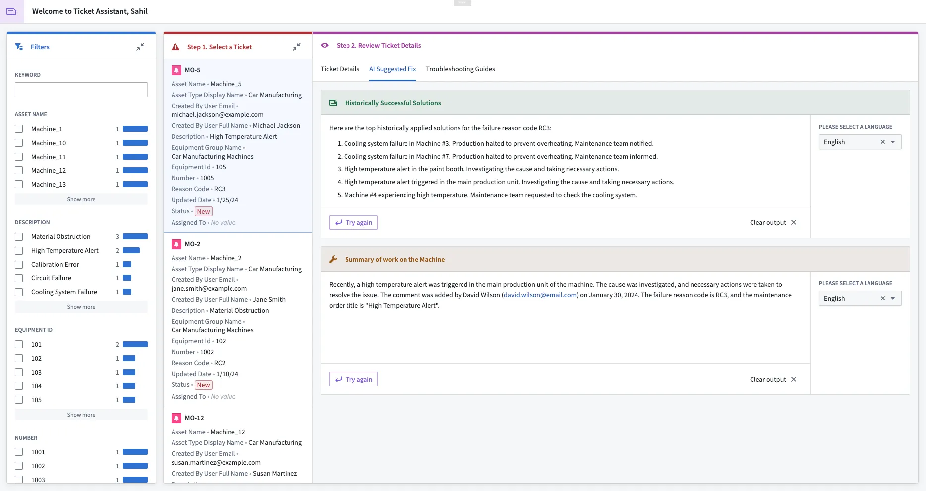 - Information at your fingertips: Proactively surface a comprehensive summary of work performed on the machine or asset recently when needed by operators.
