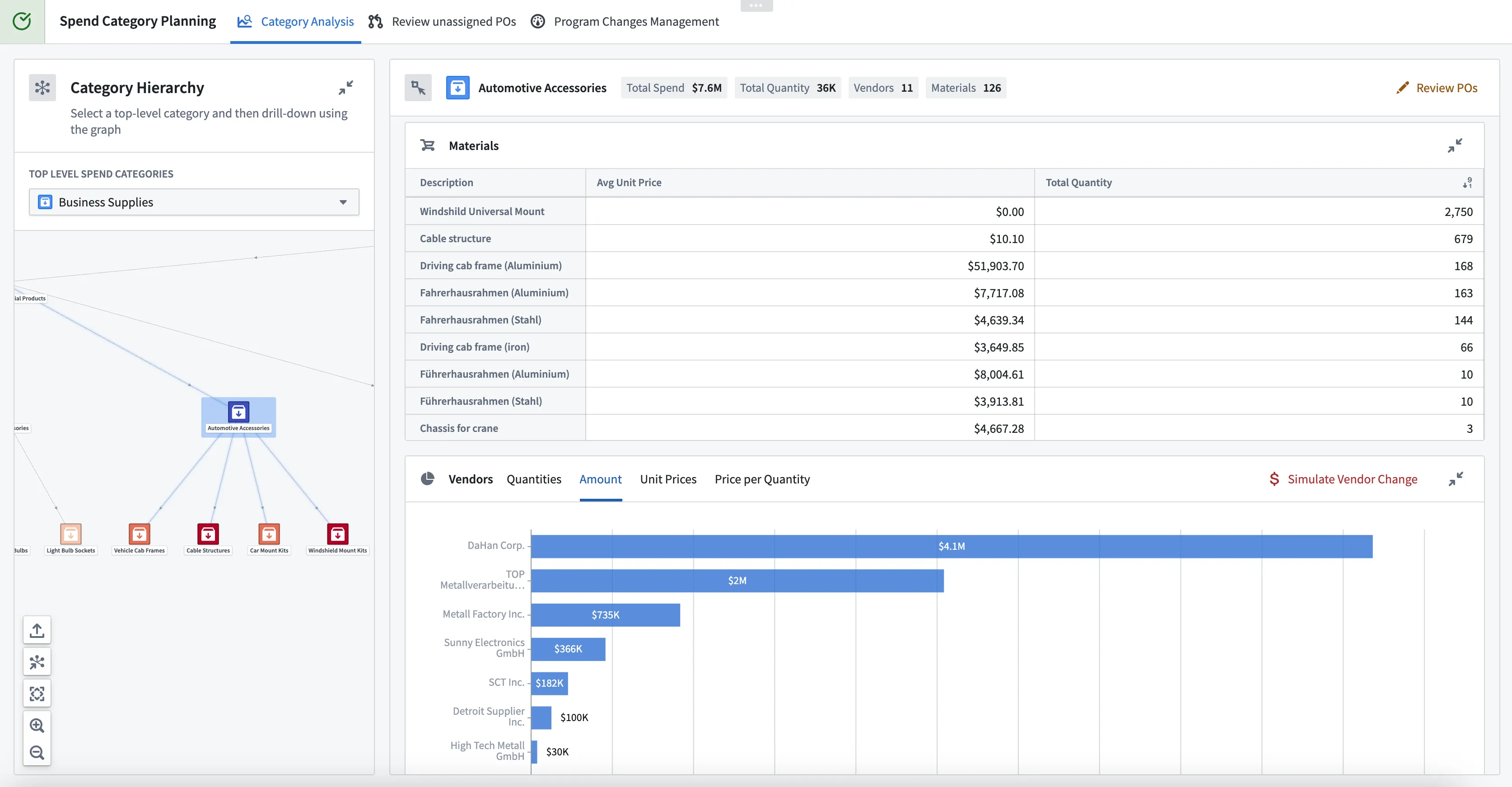 - Spend Category Management: Analyze the evolution of spend categories based on underlying materials and current vendor exposure. Evaluate potential change opportunities for categories with 'what-if' scenarios (e.g., focus on a subset of vendors) as well as evaluate risks for others.