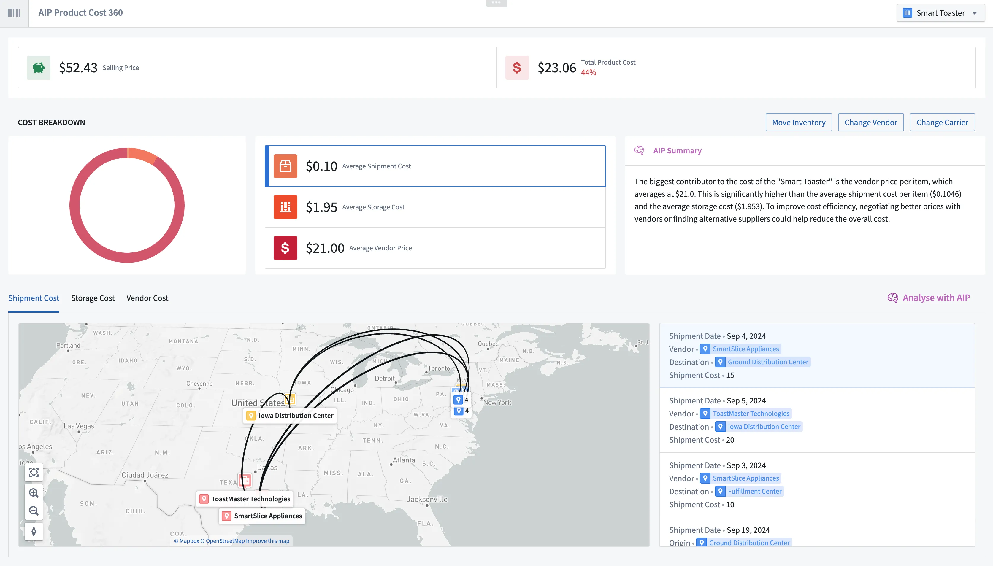 AIP Product Cost 360 provides a comprehensive breakdown of a product's cost from vendor to store, suggesting opportunities for savings. Based on a holistic view of your entire supply chain, AIP enables users to take actions to adjust inventory levels and evaluate their vendor and shipment options for cost optimization. Users can make informed decisions and trigger adjustments in live time.