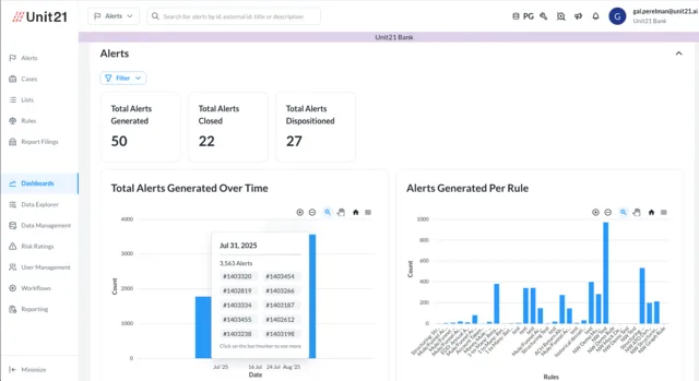 - Visual Dashboards: Over 40 dashboards to monitor alerts, case trends, investigator productivity, and KPI progress.