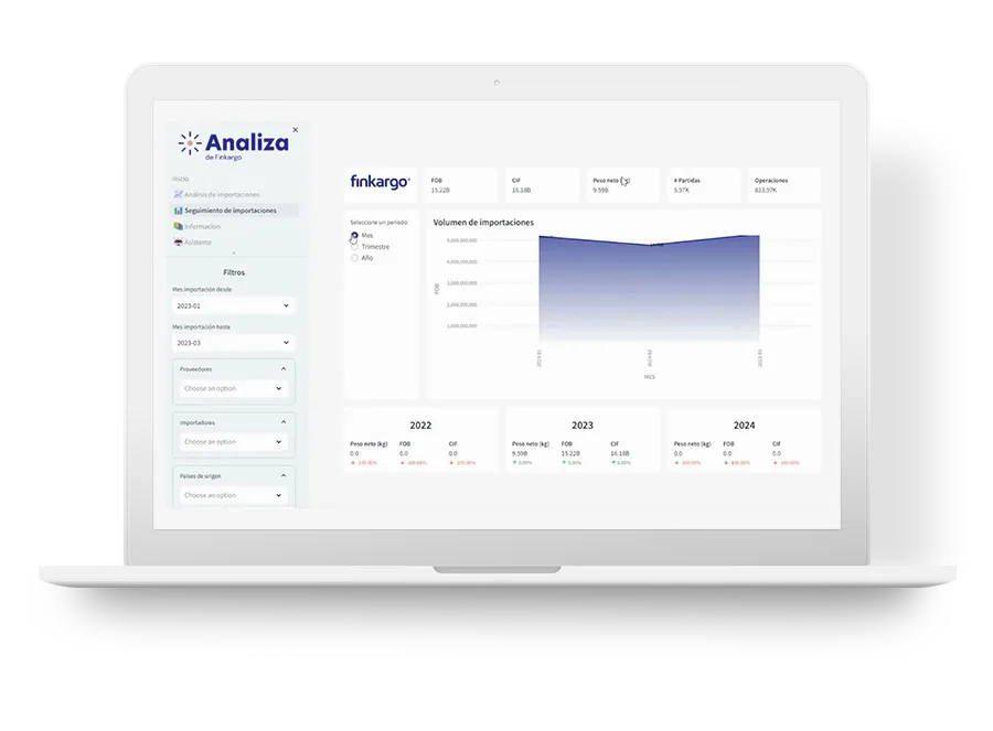 Finkargo Analiza is a cloud-based trade intelligence solution designed to help importers in Latin America evaluate international suppliers and products, plan import operations, and make data-driven decisions. The platform provides critical market intelligence by leveraging proprietary trade data and customized analytics dashboards tailored to each industry. Analiza enables users to assess supplier existence, product quality, and market conditions globally, supporting risk mitigation and strategic sourcing. The tool integrates with Finkargo’s broader suite of trade services, allowing importers to convert data into actionable strategies, optimize resource allocation, and improve negotiation conditions with suppliers. Analiza is foundational to Finkargo’s mission of empowering small and medium-sized businesses (SMBs) to overcome operational and financial barriers in international trade.