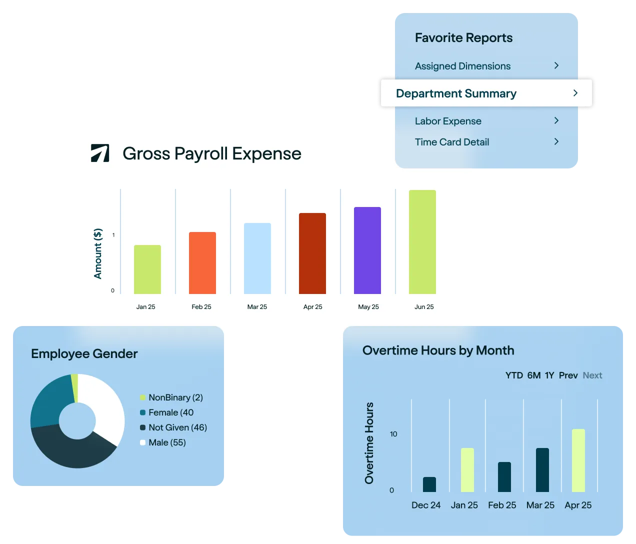 Access reports like payroll summaries, labor expenses, headcount, turnover, and more, ready to use out of the box.