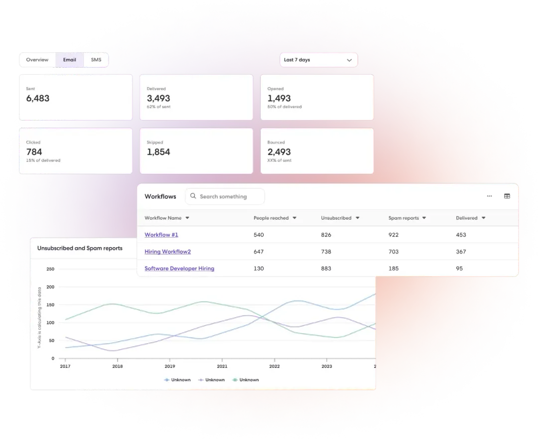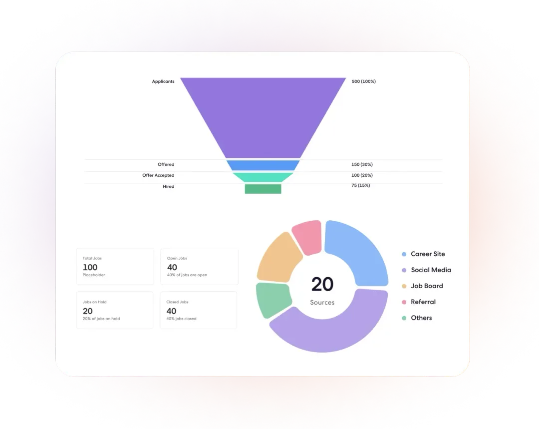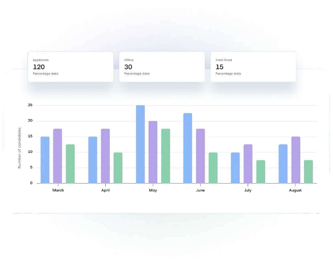 Monitor all your hiring data in one centralized platform to quickly identify challenges and performance dips in real-time. Equip your recruitment team to make informed hiring decisions and boost their effectiveness in securing top talent.