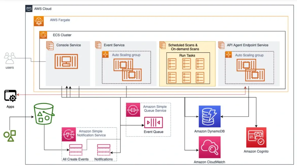 Extend AWS Solutions Amazon Simple Notification Service (SNS) is used for alerts and integrates with Slack and email. Findings can be published to AWS Security Hub. Amazon CloudWatch is leveraged for audit logging in order to track who did what in the console. AWS Transfer Family and Cloud Storage Security work in tandem to ingest and scan data at scale to detect and eliminate S3 malware.