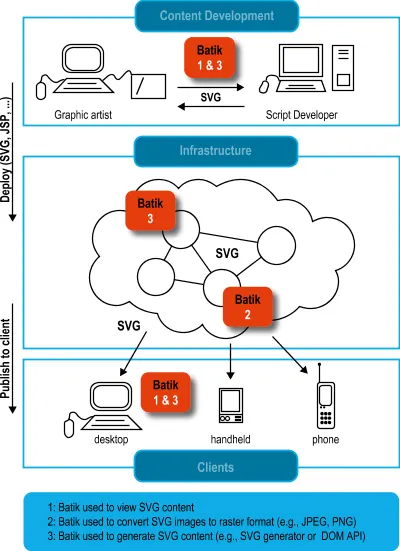 Apache Batik is a Java-based toolkit for applications or applets that need to handle Scalable Vector Graphics (SVG). It enables SVG display, generation, and manipulation, offering modular components like parsers, generators, DOM implementations, and transcoders for converting SVG to raster or other vector formats.
