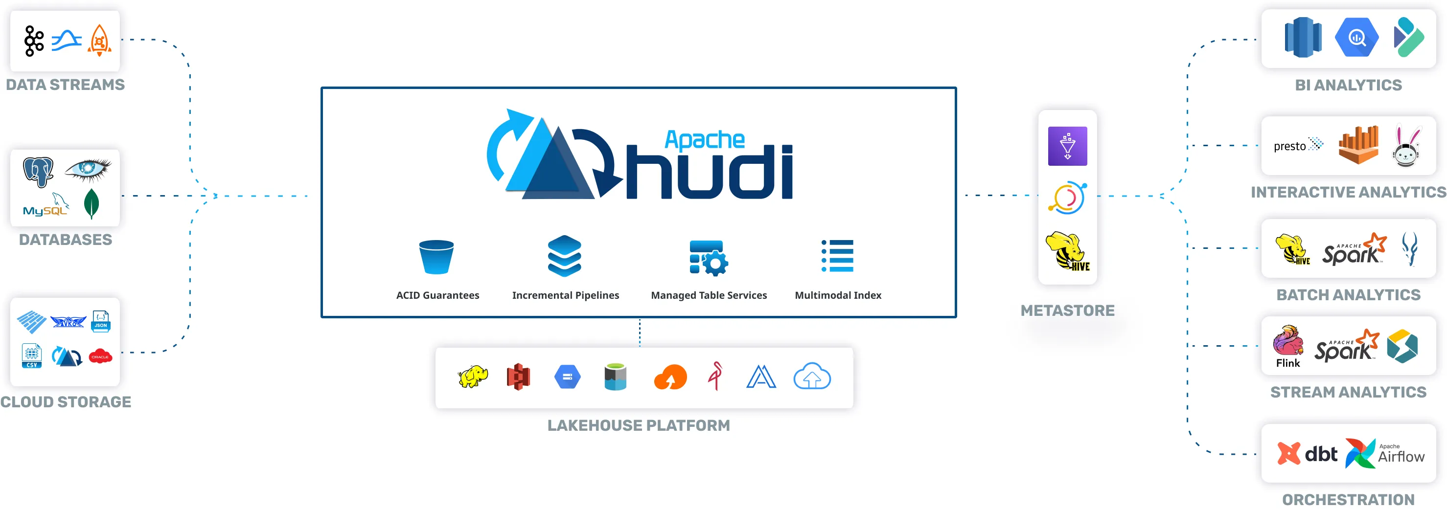 Apache Hudi is an open-source data lakehouse platform that enables efficient, incremental data processing with ACID guarantees, time travel, and schema evolution. It supports streaming and batch workloads, offers high-performance indexing, and integrates with cloud-native and open data ecosystems.
