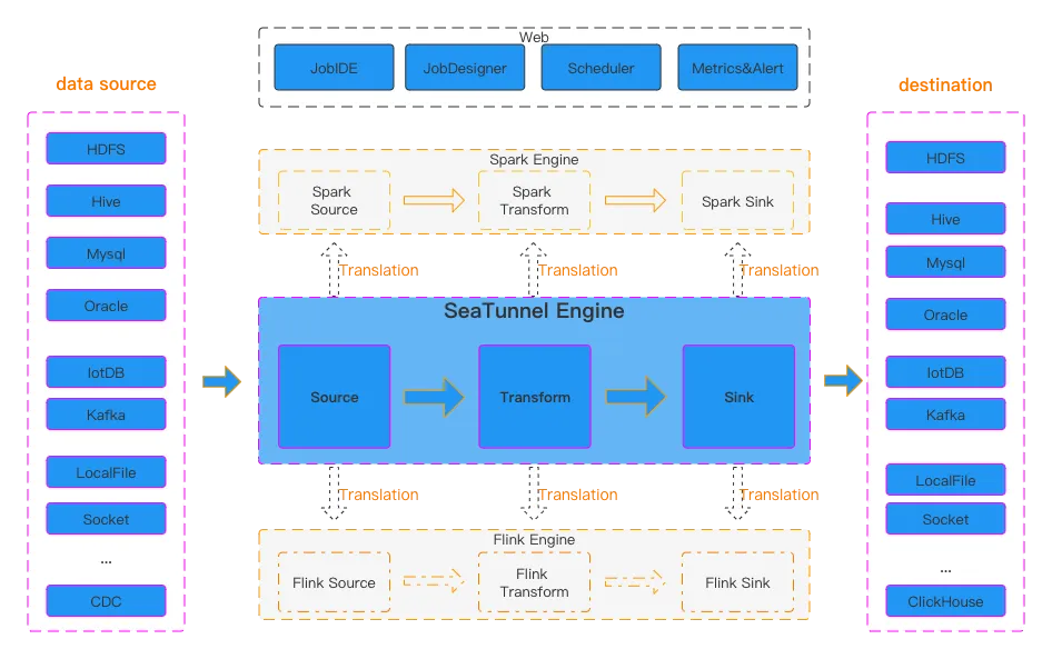 - Multi-Engine Support: Runs on SeaTunnel Engine (Zeta) by default, with support for Spark and Flink.
