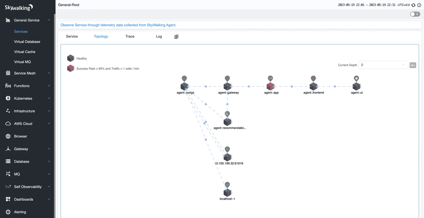 - Service Hierarchy Mapping: Visualizes relationships between services across layers like Kubernetes and service mesh.