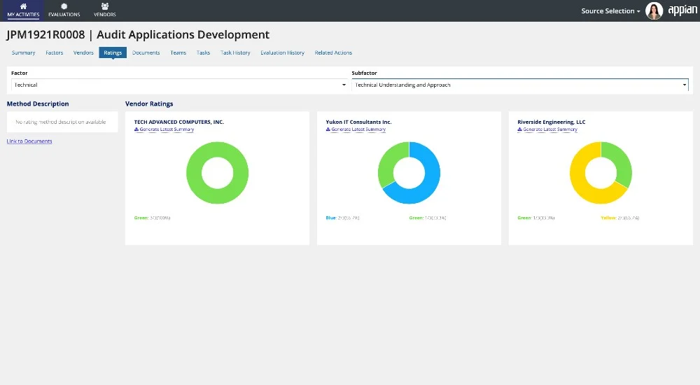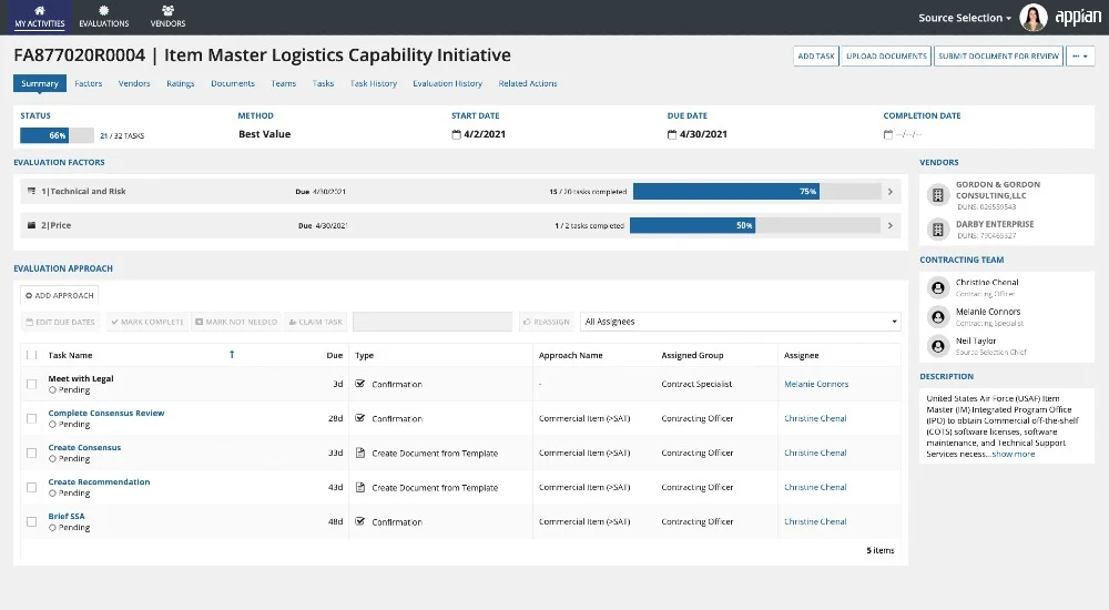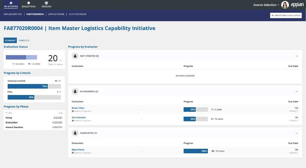 Appian Evaluation Management is designed to streamline and enhance the procurement evaluation process for state and local governments. This solution helps overcome the challenges posed by disparate systems and legacy procurement technology. By eliminating costly, time-consuming processes and disjointed collaboration, it enables users to make timely and confident procurement decisions. The application provides a single interface for monitoring and managing evaluations, ensuring real-time status updates and secure document handling throughout the vendor evaluation lifecycle.