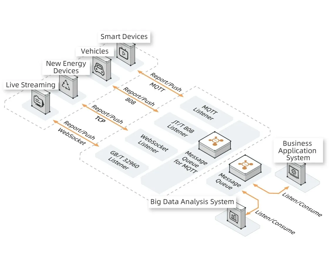 Provides a complete set of powerful, convenient, and easy-to-use operations and maintenance tools to help users quickly locate and handle issues. Statistical Reports Allows you to query devices, group and manage online devices, and view message sending and receiving statistics. Monitoring and Alerts Monitors online connections, message accumulation, and delivery latency in real time to locate issues. RESTful APIs Provides RESTful APIs to customize resource management and maintenance functions in a flexible and easy manner.