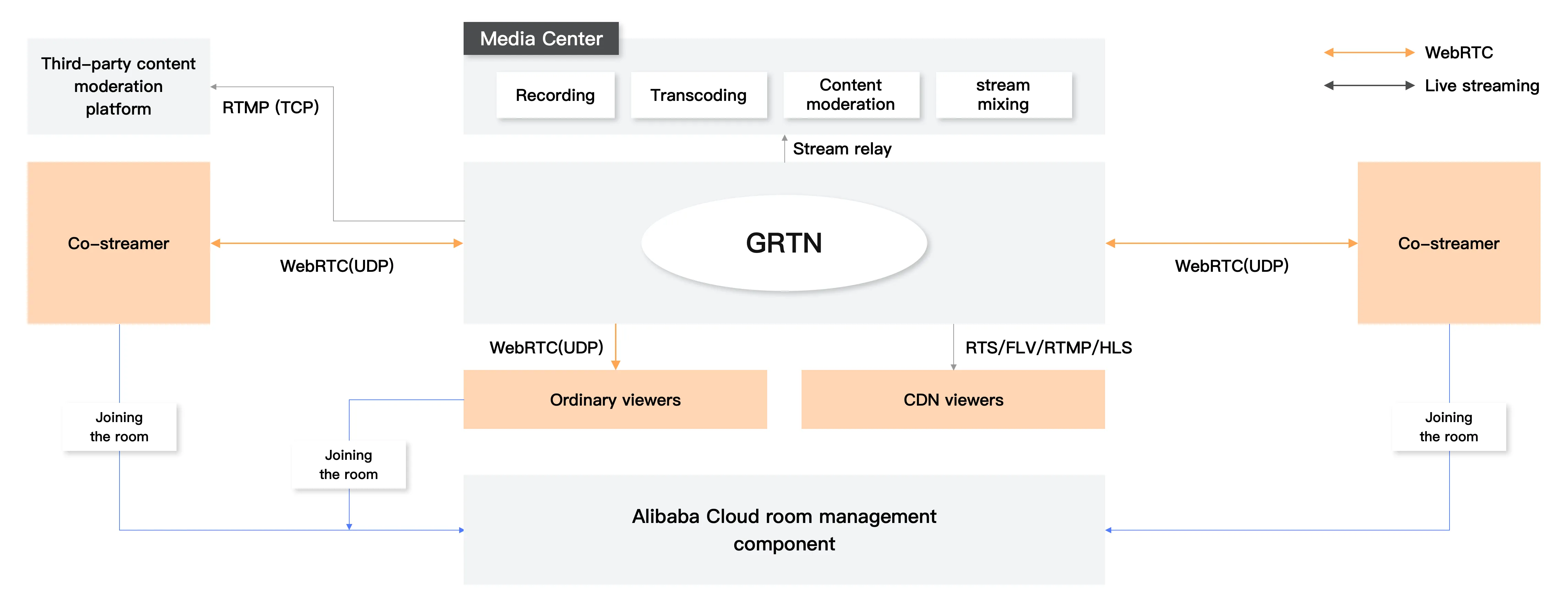 Based on WebRTC, ApsaraVideo Real-time Communication provides real-time communication with a latency within 300 ms and allows users to co-stream in a channel or across-channels. Viewers can smoothly start or stop co-streaming in real time.