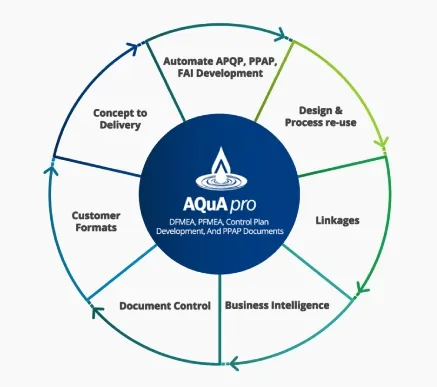AQuA Pro is user-friendly software that integrates FMEA into APQP (Advanced Product Quality Planning), PPAP (Production Part Approval Process), and connects to Process Flow and Control Plan. It simplifies and documents the product development process while complying with industry standards.