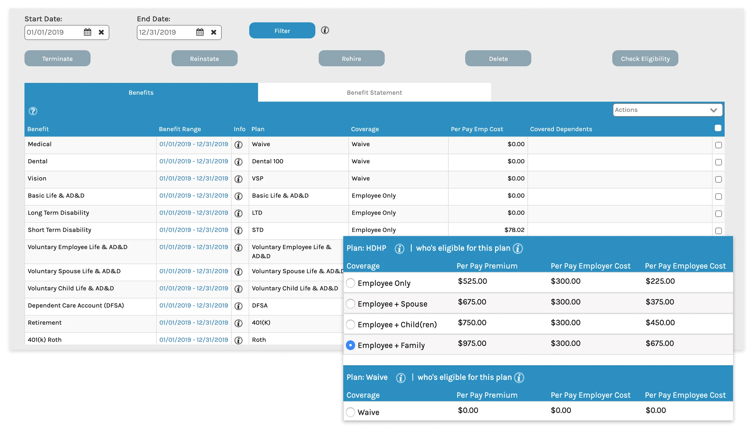 - ACA Tracking: Monitors eligibility, coverage offers, and affordability to generate required forms and maintain compliance with ACA regulations.