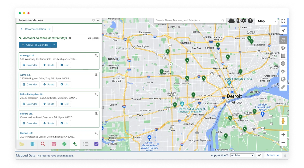 Allow for route-based actions on standard and custom objects, ensuring users make the most efficient and strategic stops.