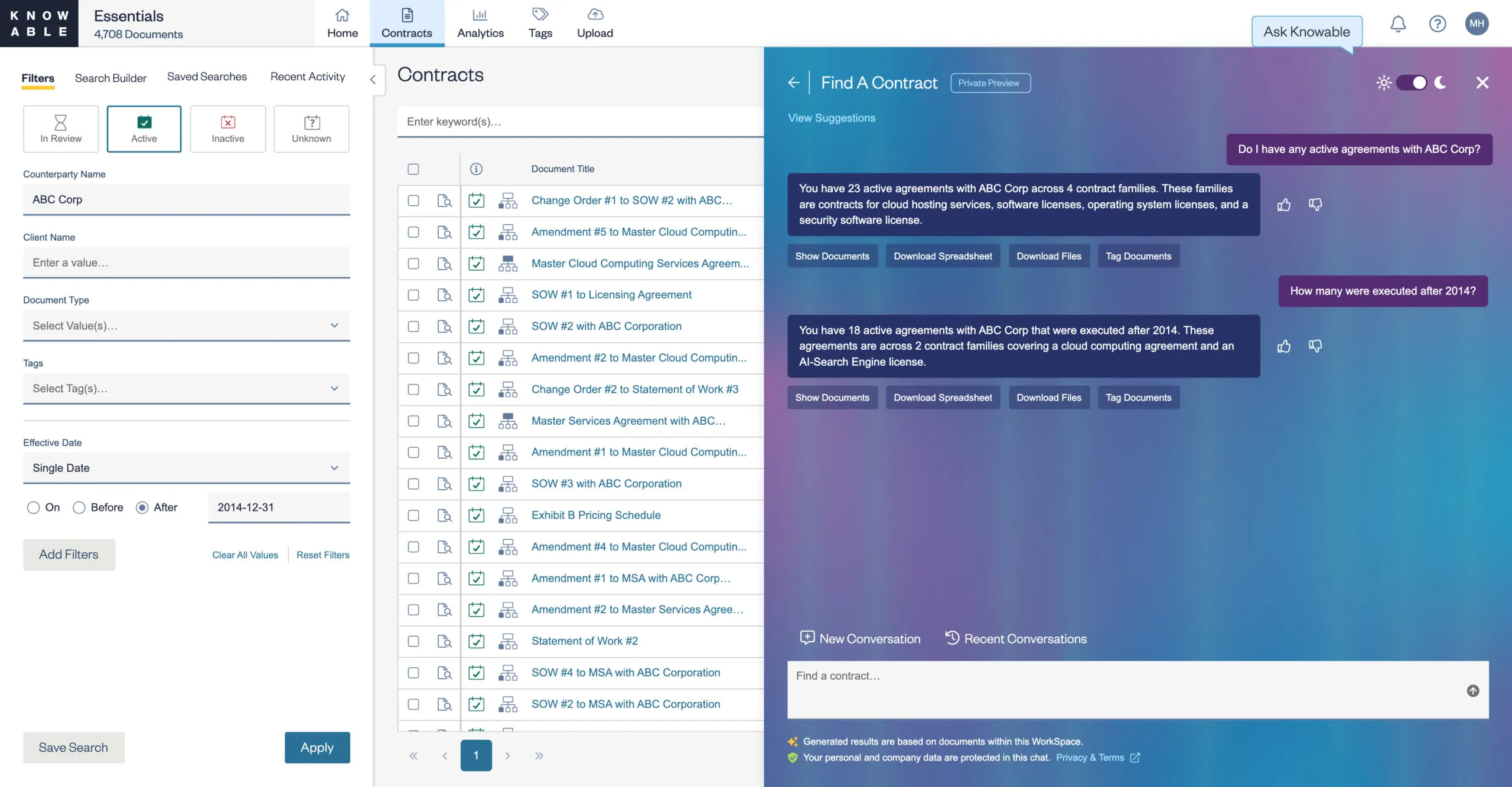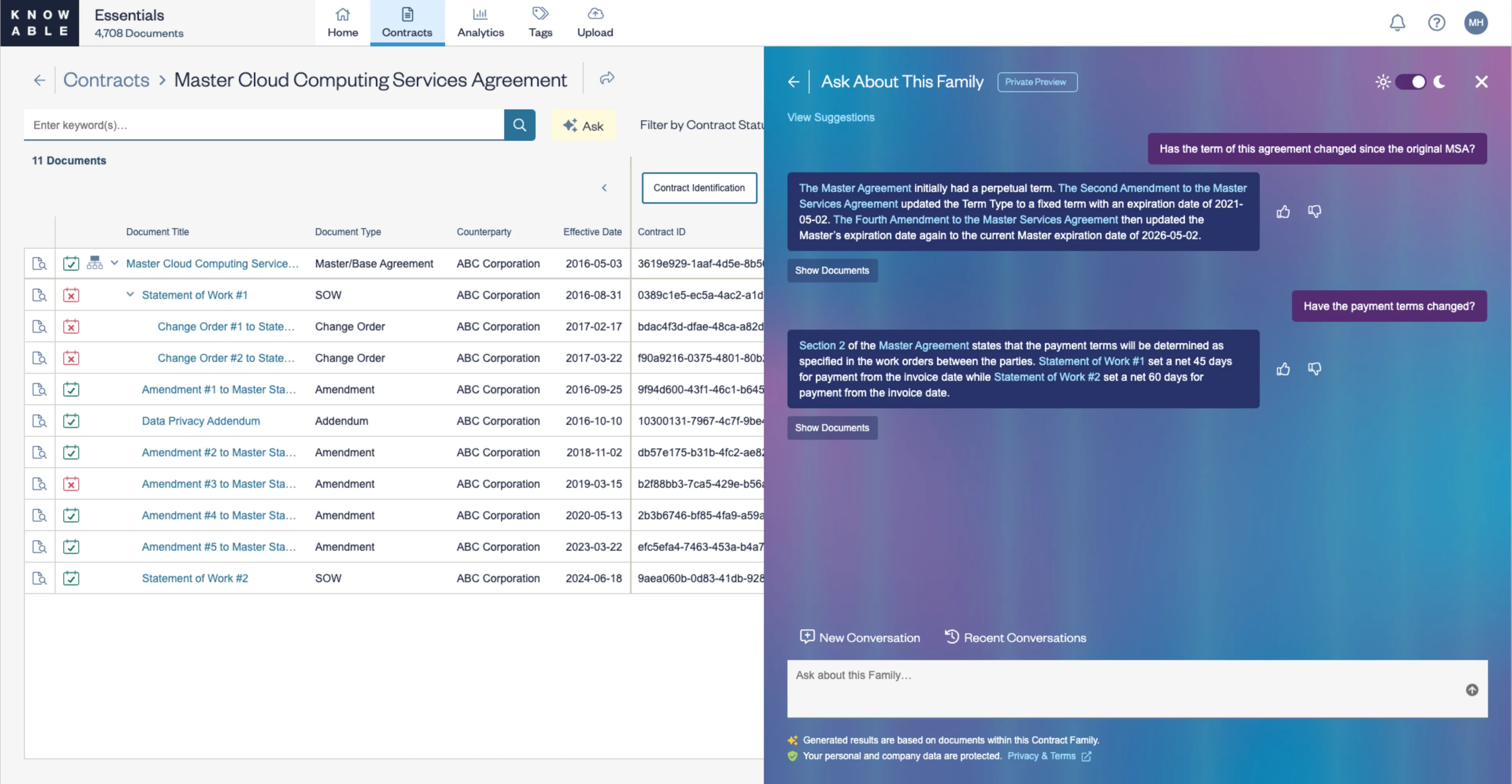 Build a modern legal department by creating a scalable platform organized around data that is easy to access and understand. With Knowable Essentials, contract text is converted into structured data and organized into families to create a complete and accurate contract system of record. With AI-powered Ask Knowable, you can effortlessly navigate your contract portfolio and sift through lengthy, dense documents with ease.