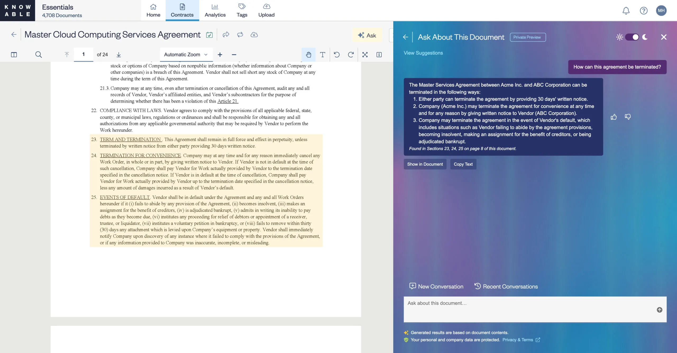 Everyone wants to work faster, but accuracy is key. Contracts are packed with complex details and nuanced language, making it challenging for both legal and non-legal teams to confidently find the right information while considering all the important factors. Ask Knowable is an AI-powered contract assistant that leverages the unique attributes of Knowable Essentials to provide reliable answers to day-to-day contracts questions.