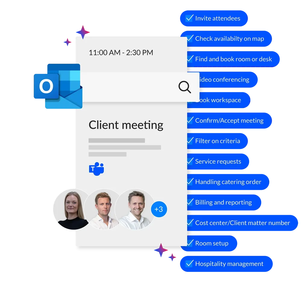 - Facilitates real-time booking of rooms and workspaces, including hot desking and flexible seating, via an Outlook Add-in, mobile app, and interactive maps.