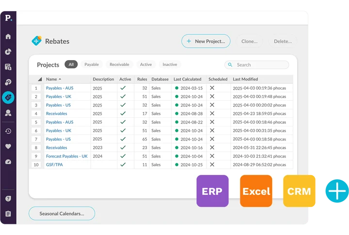 Project and Rule Management: • Groups related rebate rules into projects for better organization. • Flexible rule creation supports both simple and complex rebate strategies. • Seasonal calendar support adjusts calculations for time-based performance.
