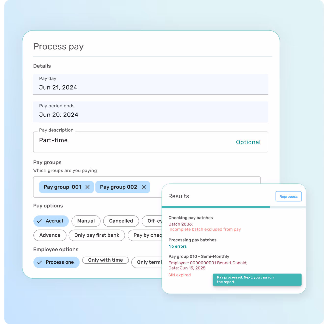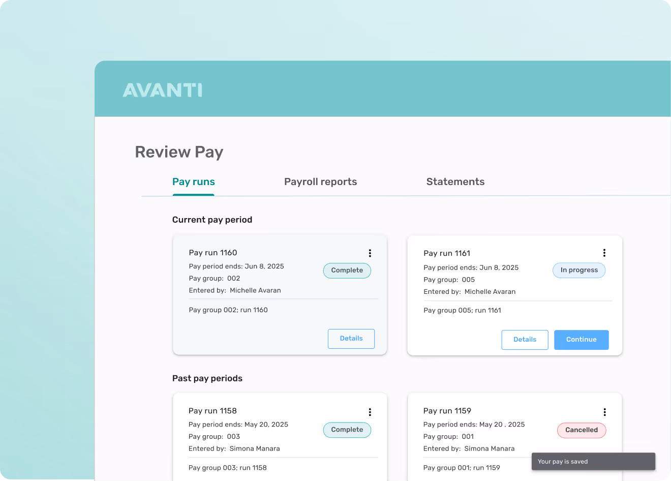 - Automated & Flexible Payroll Processing: Simplifies how teams are paid, reduces errors, and eliminates extra costs for off-cycle or cancelled payroll runs.