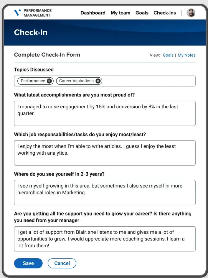 Avature allows you to design a forward-looking and streamlined performance review process to help employees reach their full potential. The appraisal can include a direct report self-assessment on goals and competencies, a peer review, and a manager-level evaluation. Managers can also guide employee development using relevant data from feedback, check-ins, notes and an employee’s overall performance history.