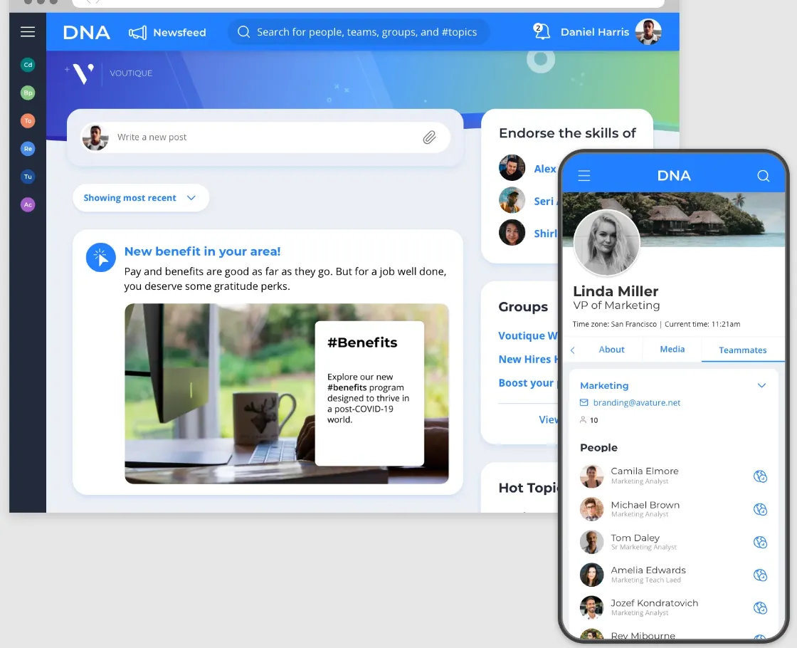Combining Avature Performance Management with Avature DNA, you can foster a high-performance culture by publicly announcing achievements, promotions and outstanding key results. In addition, colleagues can publicly recognize one another for actions associated with your core company values – thus reinforcing desired behaviors. You can also promote ongoing development by targeted learning and mobility opportunities based on employee skills, interests and areas of development.