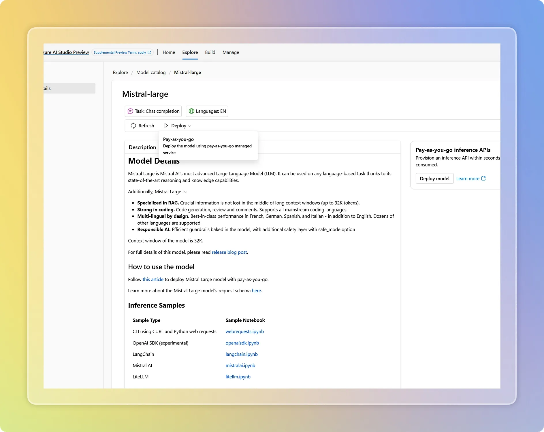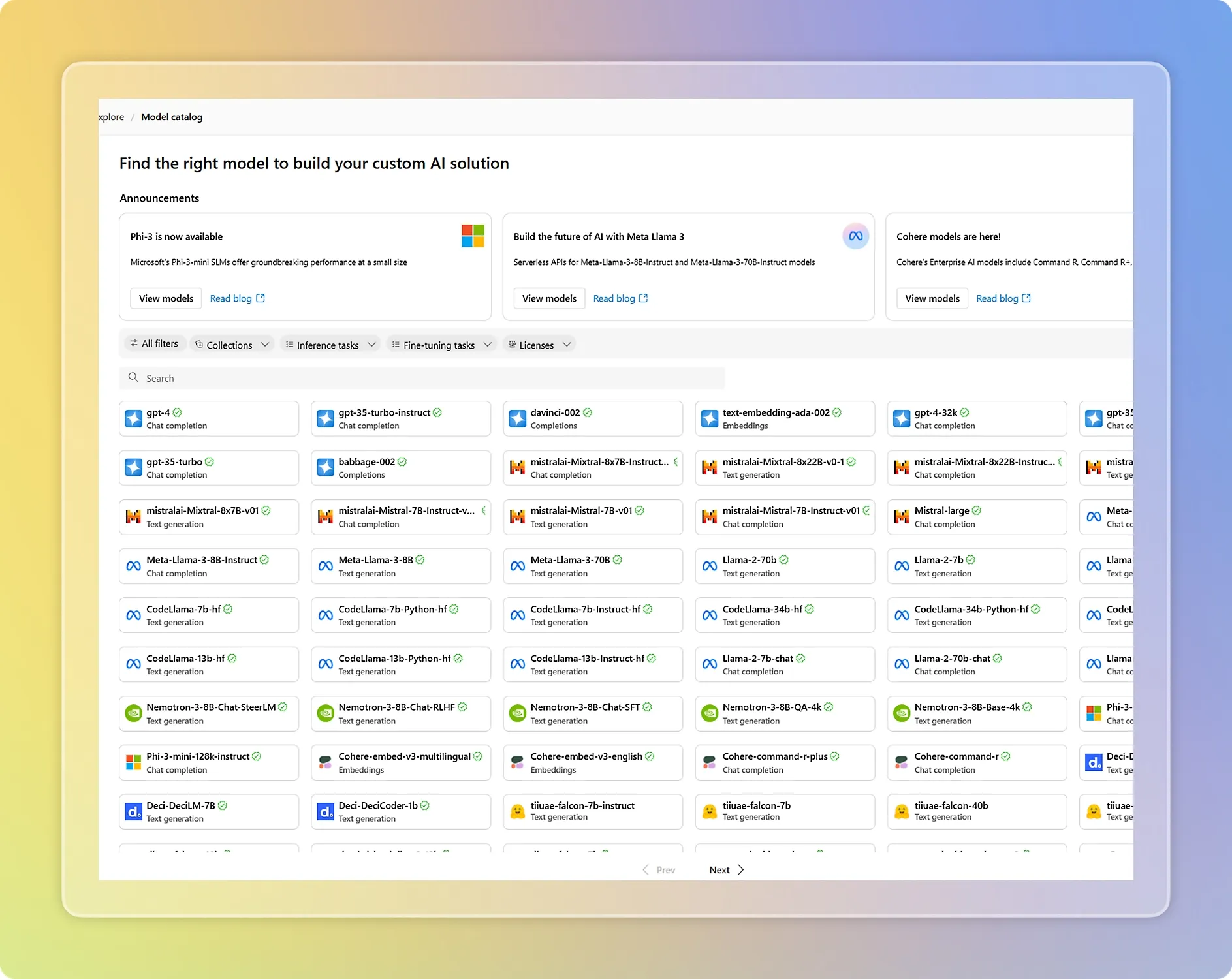 Innovate faster with popular models from creators such as Microsoft, OpenAI, Mistral, Meta, Stability AI, Core42, and Nixtla.