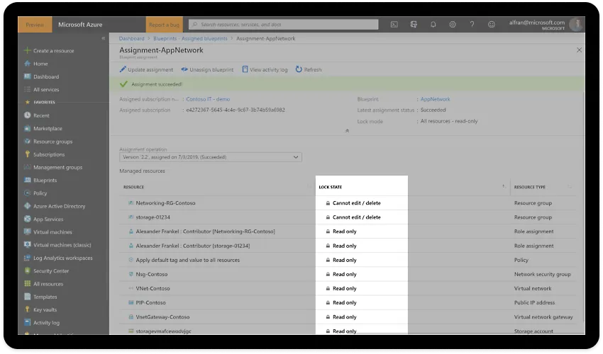 - **Lock foundational resources: **Avoid unwanted changes and misconfigurations—even by subscription owners—that could affect multiple applications. With resource locking, you can limit access to key infrastructure that’s shared across subscriptions. Protect resources that the blueprint is governing and configure exceptions to match your specific needs.
