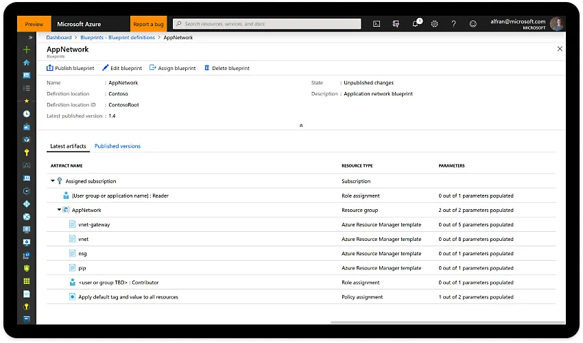 Simplify largescale Azure deployments by packaging key environment artifacts, such as Azure Resource Manager templates, role-based access controls, and policies, in a single blueprint definition. Easily apply the blueprint to new subscriptions and environments, and fine-tune control and management through versioning.
